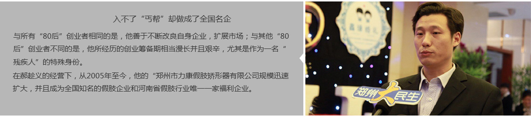 鄭州市力康假肢矯形器有限公司(簡稱力康),是一家專業從事假肢矯形器的設計、研發(fā)、制作及裝 配的專業機構。成立于1992年是河南省唯一一家福利企業。力康下設業務部、技術部、住院部、康復 部、售后服務部,并配有現代化的裝配車間和功能齊全的訓練大廳,為殘疾朋友康復訓練提供了可靠 保障。總經理穿戴假肢多年,有著豐富的臨床經驗和親身體會;多年來,力康已為全國幾十萬名殘疾 朋友安裝上舒適、美觀、耐用的假肢和矯形器具,使他們更大限度地恢復了正常的工作和生活?!爱a 品即人品”的質量理念、先進的技術、實惠的價格、完善的售后服務是力康取勝的法寶……